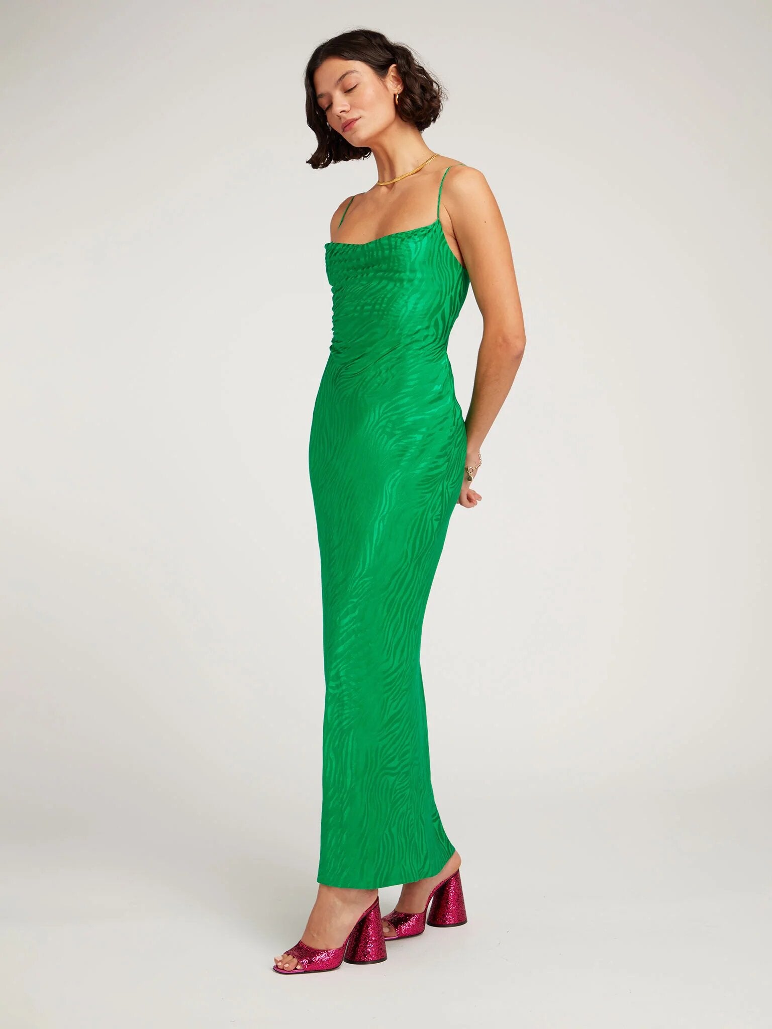 Omnes Riviera Maxi Dress in Green Zebra Jacquard, $, available at Omnes