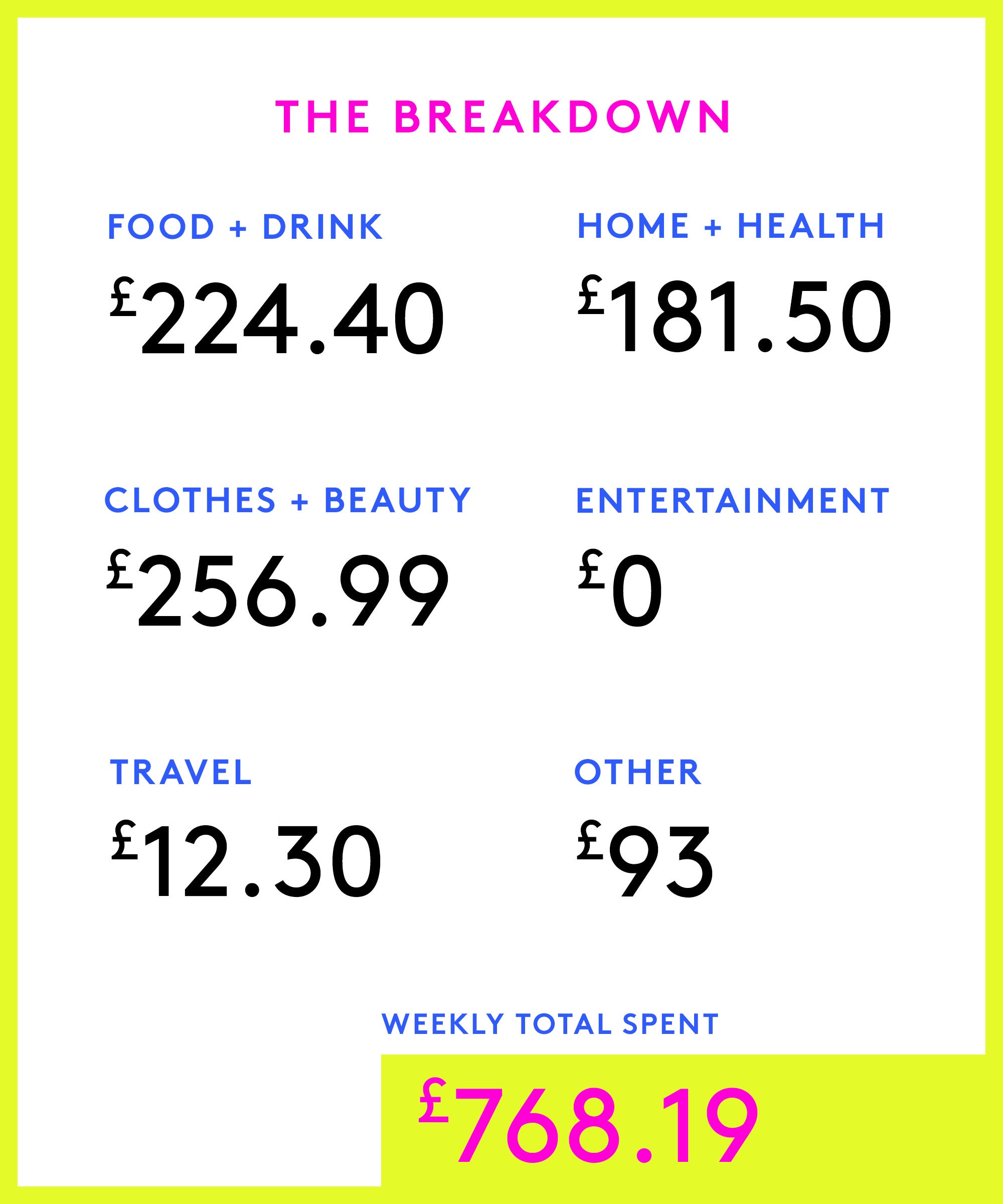 “I had no idea this was such an expensive week! I had a couple of unusual costs this week, like buying new coats and having a therapy session, but it definitely shows how easy it is to run over budget. I don’t have a very active social life and yet still managed to spend quite a bit of money on going out, although that is symptomatic of where I live. Some days it feels like I can’t leave the house without spending money, and it was quite sobering that that seemed to be the case this week. I really want to try and aim for a couple of ‘no spend’ days per week to see how much this impacts my finances!”
