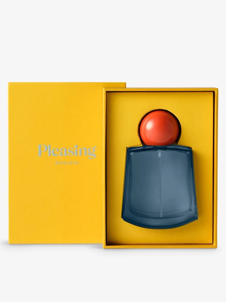 “First up is the packaging which I both love and hate. On the outside you have the cardboard boxes in various bright, bold and clashing colour combinations with a strong retro energy (the yellow and blue box for Rivulets especially gives me ’70s vibes). These are the kind of boxes you’ll want to keep forever and put on display. Inside these you find the coloured glass bottles of perfume topped with with Pleasing’s signature round, marble-like lids and finished with a rounded bottom so it can rock side to side; balancing like an expensive glass mistake just waiting to happen. For anyone who is clumsy, owns a pet or has small children, or likes to clutter their vanity with many trinkets, I just know that these perfumes won’t work. I tick all three boxes and have already had to save my bottles from my cat’s curious paws. (And that’s saying something because these perfumes have a significant weight to them).” — Esther Newman, Affiliate Writer