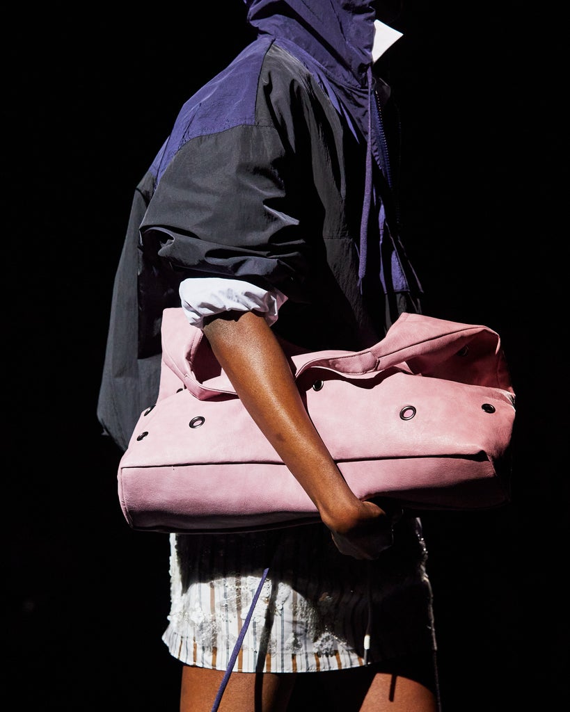 In terms of accessories, so-big-you-can-hardly-clutch-them clutches were toted by models at the Baum und Pferdgarten, Forza Collective, and Remain. While the handbag trend makes an impact on the runway thanks to the oversized shape (and bold colours, too), in real life, you can recreate the look in a more practical manner by opting for totes that you can fold into clutches only when necessary.