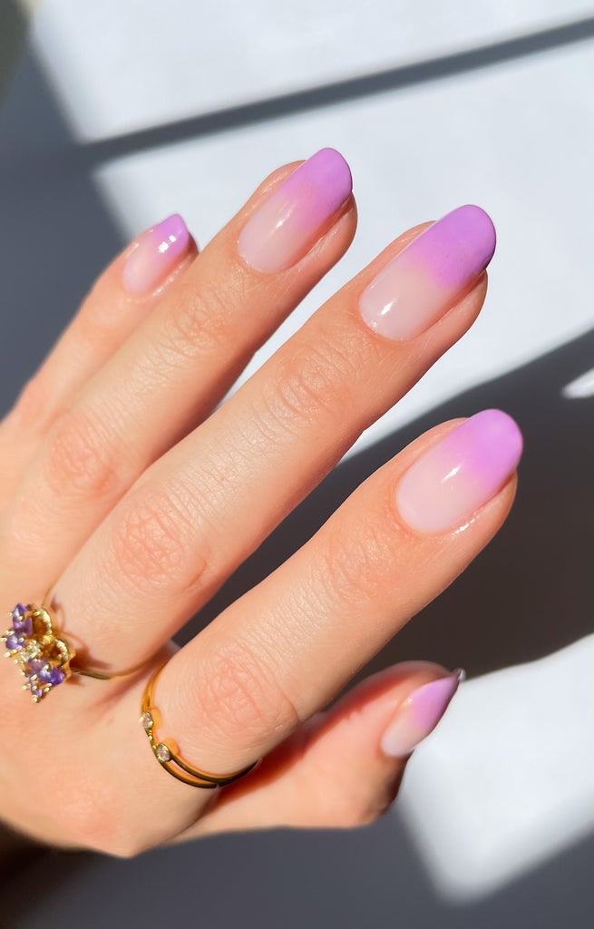 Like a coloured French manicure, this is a slight adaptation on the French. Instead of a thin purple line at the tip, it’s a graduated ombré blend from the tip down to the middle of the nail. If you’re at the nail salon, you can show this to your nail artist as inspiration for a regular polish or gel service. If you’re at home, you could use a Beautyblender or makeup sponge to achieve a similar result. Here, Brush uses Essie Nail Lacquer in Play Date, £8.99, (a bright purple) for the tip alongside Zoya Lavender Perfector, £14.95, (a sheer purple) to create the ombré blend.