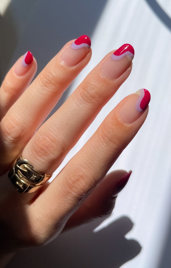 Like an abstract French, a two-toned French is as simple as it sounds: You combine two colours. For Valentine’s Day, we’re very into a red and pink colour palette. You could really mix it up however you want. That’s the versatility of a deconstructed French manicure.
