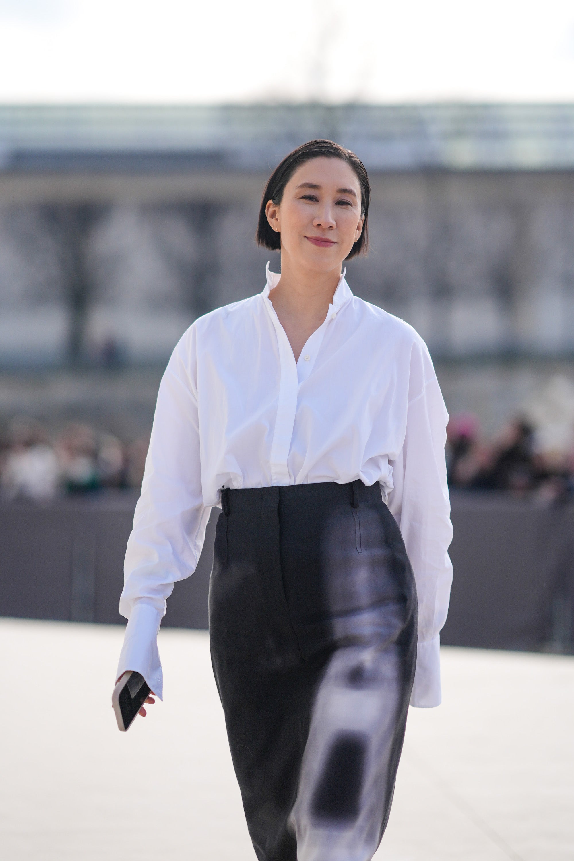 This short, sharp bob is set to be a huge trend for 2024 according to Neil Moodie, founder of the Neil Moodie Studio in London’s Spitalfields. “It’s essentially the shortest bob before entering ‘short hair territory’, resting delicately between the jawline and cheekbone and grazing the bottom of the ear,” Moodie told R29. Look to this cut on Eva Chen.Photographed by Edward Berthelot/Getty Images