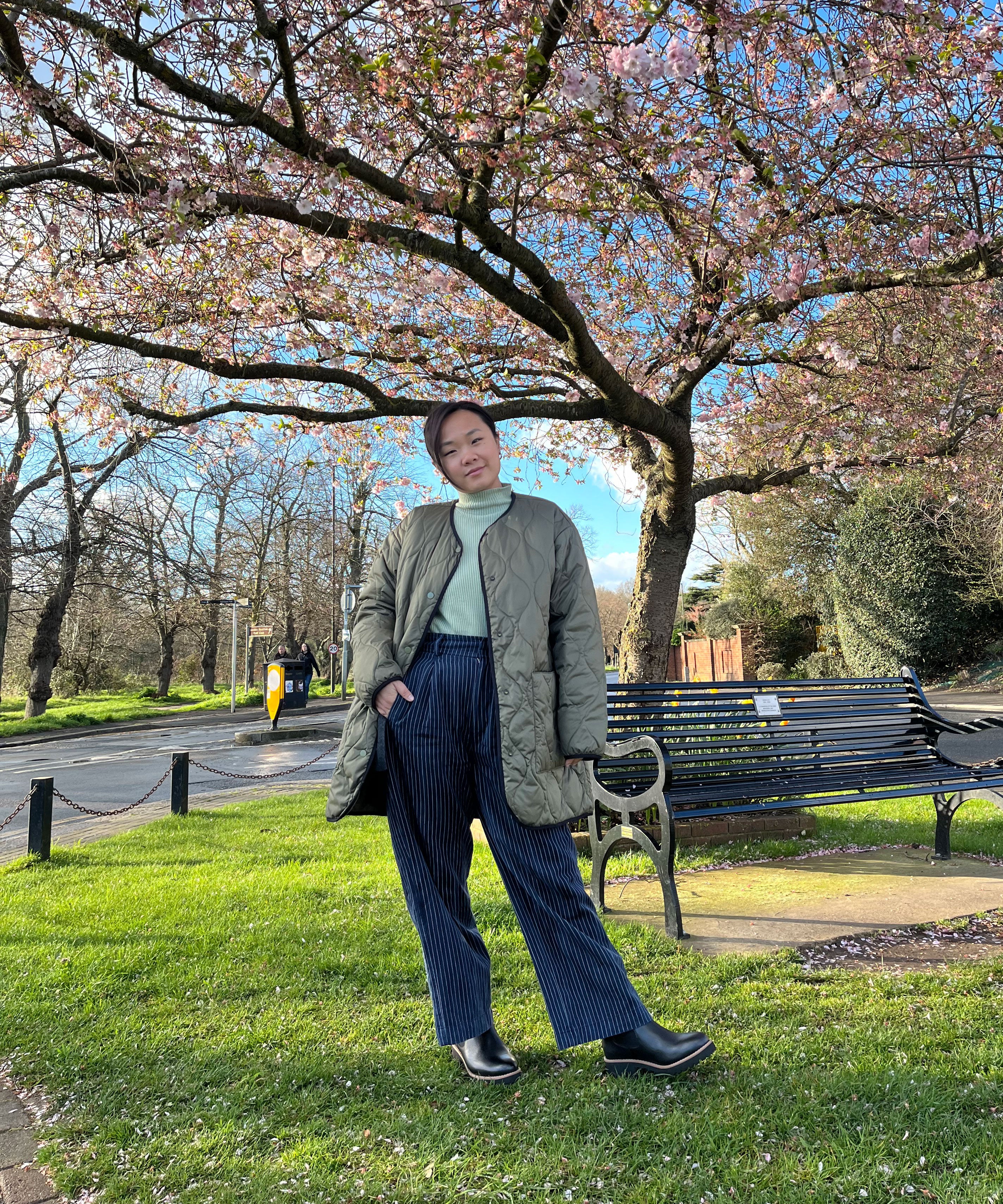 “I already have a pair of these in the blue colourway (now sold out) and instantly they became a go-to piece in my wardrobe — especially during this odd, in-between early spring season we’re currently in (odd warm days interspersed with storms and showers). And so, I decided to add to my collection with this beautiful, pastel lilac/yellow combination. These trousers are made with a sturdy enough cotton material to stave off any chill, but are light enough for those rare sunny moments; loose and comfy for curling up with a book and cup of tea in the garden, but also stylish enough if last-minute pub plans are made. I’m wearing mine with a chunky knit and pair of Birkenstock Bostons for a cool Scandi girl vibe.” — Esther Newman, Affiliate Writer & Content Producer