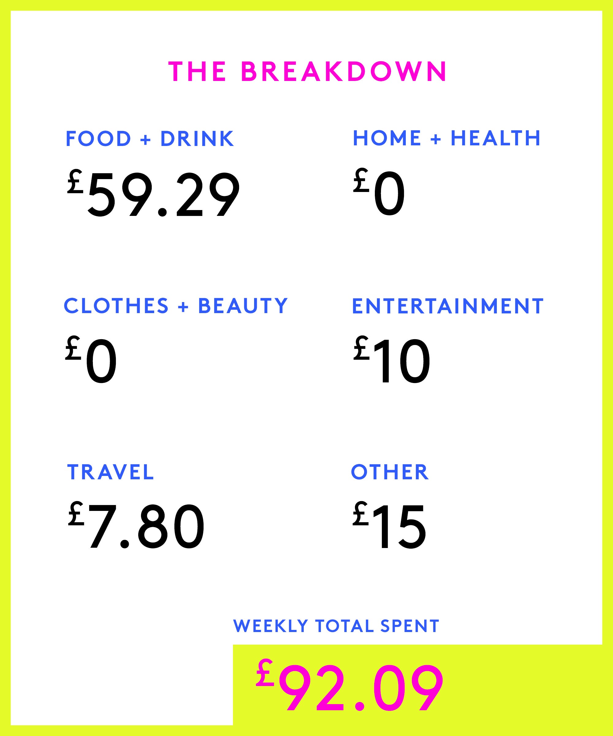 “I would say this is fairly average spend week for me. Although I don’t spend money on birthday gifts or the funfair every week, this amount would normally be spend topping up toiletries or on petrol, neither of which I had to do this week. Also, some of my activities were paid for in advance so weren’t included in this week’s spend. As expected, I don’t spend a lot during weekdays when my activities are limited to work and the gym, but this ramps up at the weekend when I do more social activities. I think the process of recording my spend made me more conscious about what I was spending which isn’t necessarily a bad thing. Seeing my savings amount in black and white has also made me grateful that I have been able to prioritise saving for a rainy day which I appreciate not everyone is able to do.”