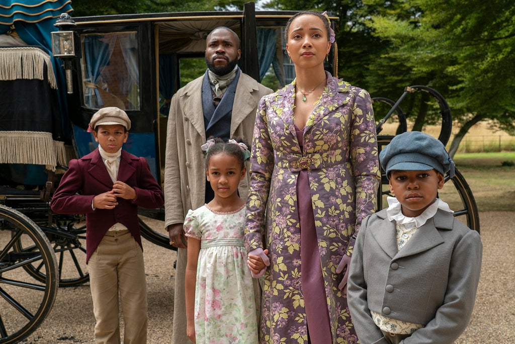 In episode 1 when we catch up with the Mondrichs, their entire world is about to change “completely and utterly,” as Naomi puts it to Unbothered over Zoom while sitting beside her co-star and on-screen husband. Their son Nicholas has inherited Alice’s aunt Lady Kent’s entire estate and fortune. “She has left your son Nicholas everything,” a solicitor says when he breaks the news. When Alice and Will’s son becomes Lord Kent, they enter society as equals to the rest of the ton. Instead of a bartender and his wife, they are the Baron and Lady of Kent. “We have to kind of understand what it means to have this title and so there’s a lot of self-discovery,” Imhangbe chimes in.