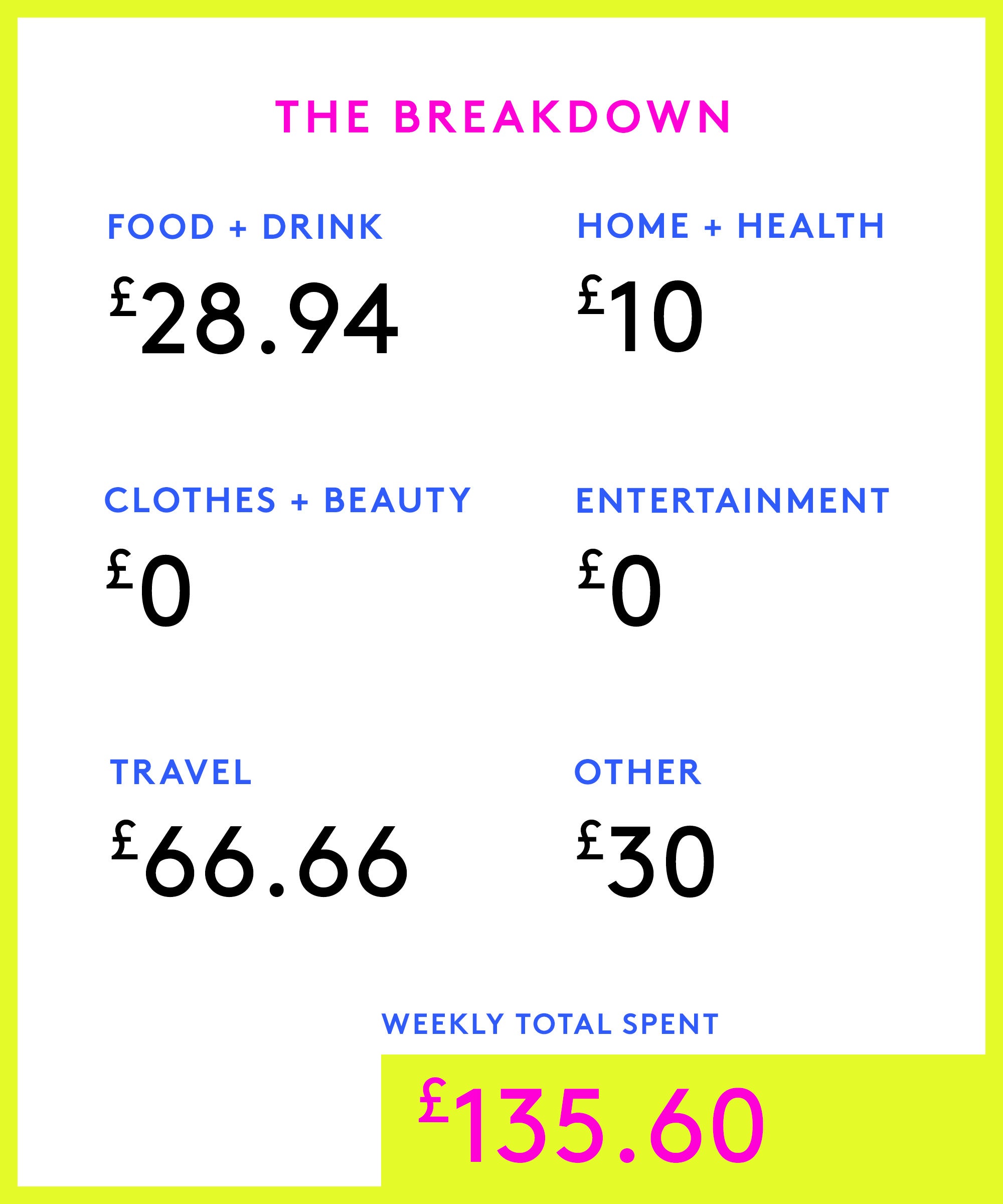 Utilities: Water, electricity and internet are included in my rent. I only pay council tax, which comes to £144 per month.