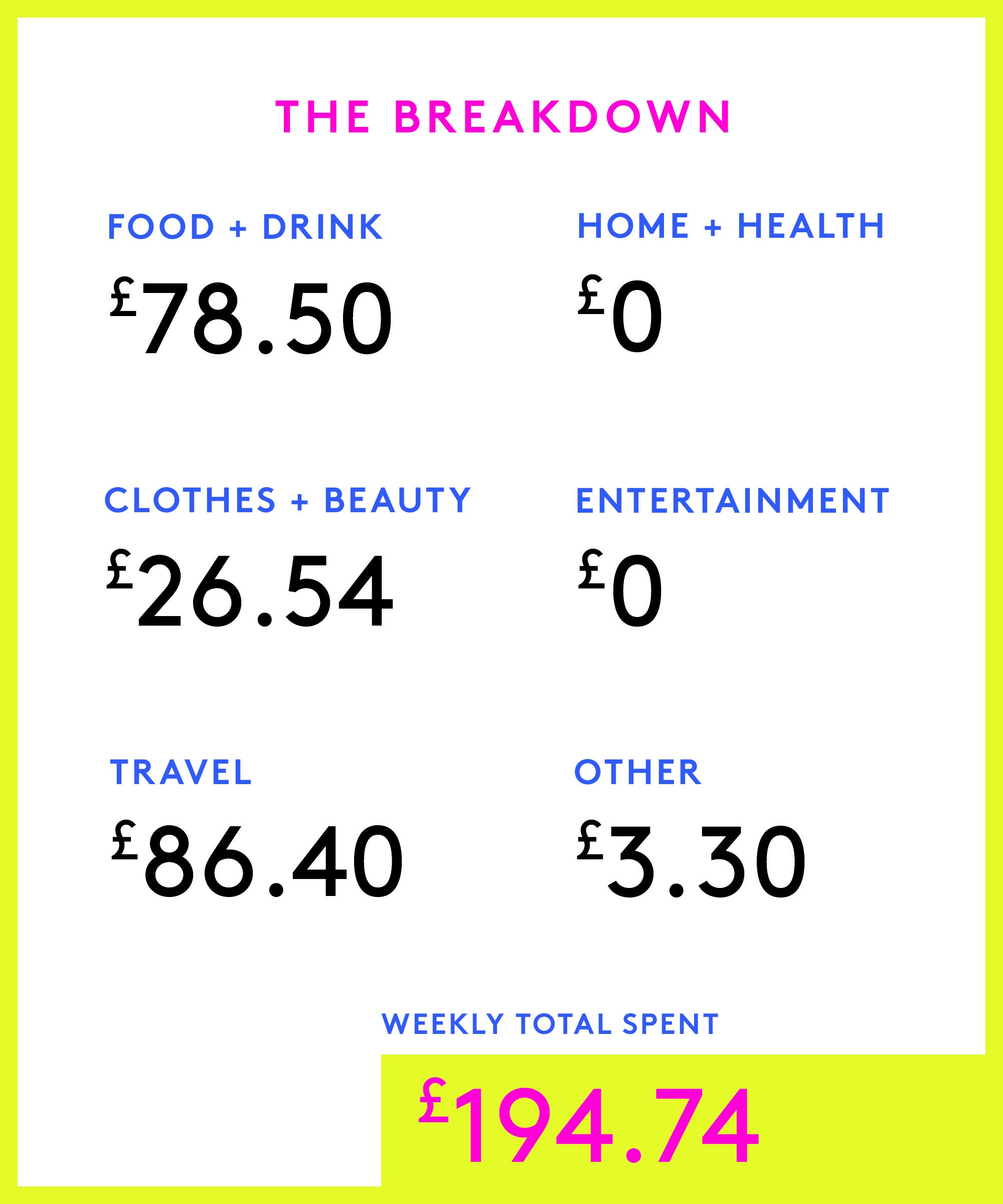 “I think this week was definitely a bit abnormal as I don’t have days out in London every week or have to pay for expensive Ubers home. However I was surprised about how much I spent on food and drink and how that seems to be the way I see my friends. I’d love to do more free activities with my friends such as walks or movie nights but sometimes it seems the only way to see them is by going for drinks or food. I know I am also very lucky to work in an industry where when I go for drinks, they are normally paid for by someone else. I dread to think what it would cost me otherwise and how it would impact my other spending and saving. By considering all my daily spends, it has driven me to work harder at furthering my career to earn a higher salary and not have to worry too much about daily spending.”