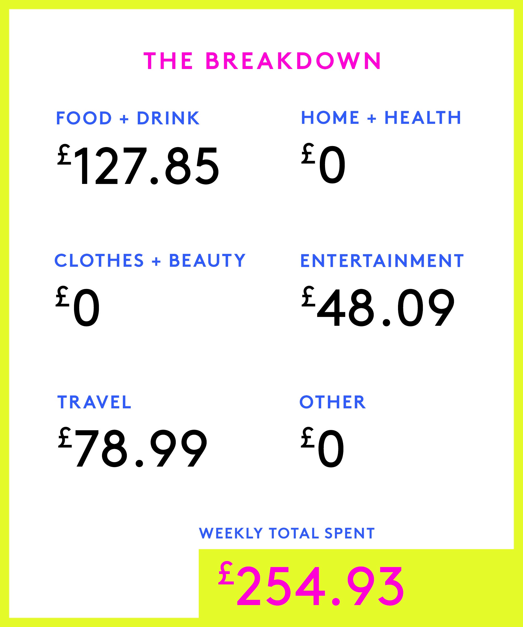 “This week was a fairly typical week of spending other than the £75 spend for the vacation rental. I also usually have one night a week in by myself so I was a tad more busy than usual. Unsurprisingly, my biggest spend was on food and drink out with friends. Even with my big night out in central London (with a hefty entrance charge for the comedy show), I didn’t break £75 for the day so I don’t feel that I’m splashing out too much. That being said, it adds up — if I want to get serious about saving more money, I will eventually have to be more mindful of where and how often I socialise.”