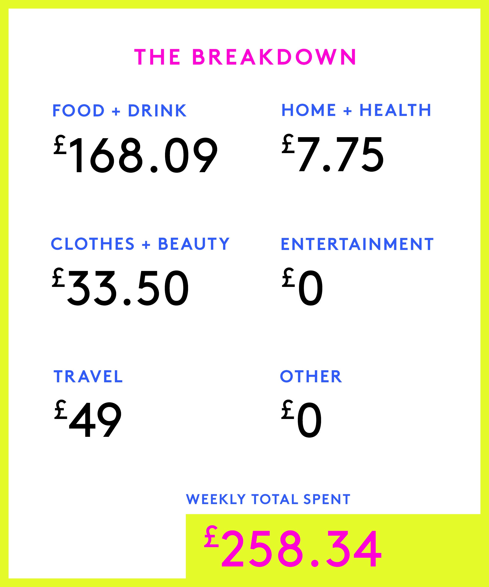 “It’s interesting to see this totalled up. This week was probably slightly higher than normal as we don’t usually go out for dinner and drinks twice every week (though it’s not unheard of). I think I will try to cut down a small amount of spending as I know that if I do this every week, it will make a big difference, and I think I’ll still be enjoying myself. I’m not at all surprised that food and drink is the main thing I spend on as especially over the colder months, this is mainly how I socialise.”