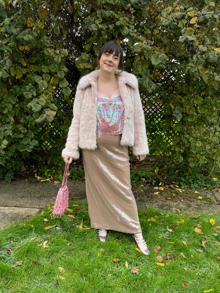 For night, my inspiration was sugar fairy, Barbie mermaid princess, but in a 1950s starlet kind of way. There’s nothing more glamorous to me than sequins and faux fur so I added an old Topshop jacket, plus some more shine with a pink cami, metallic Mary Janes and a beaded bag to complete the vibe.