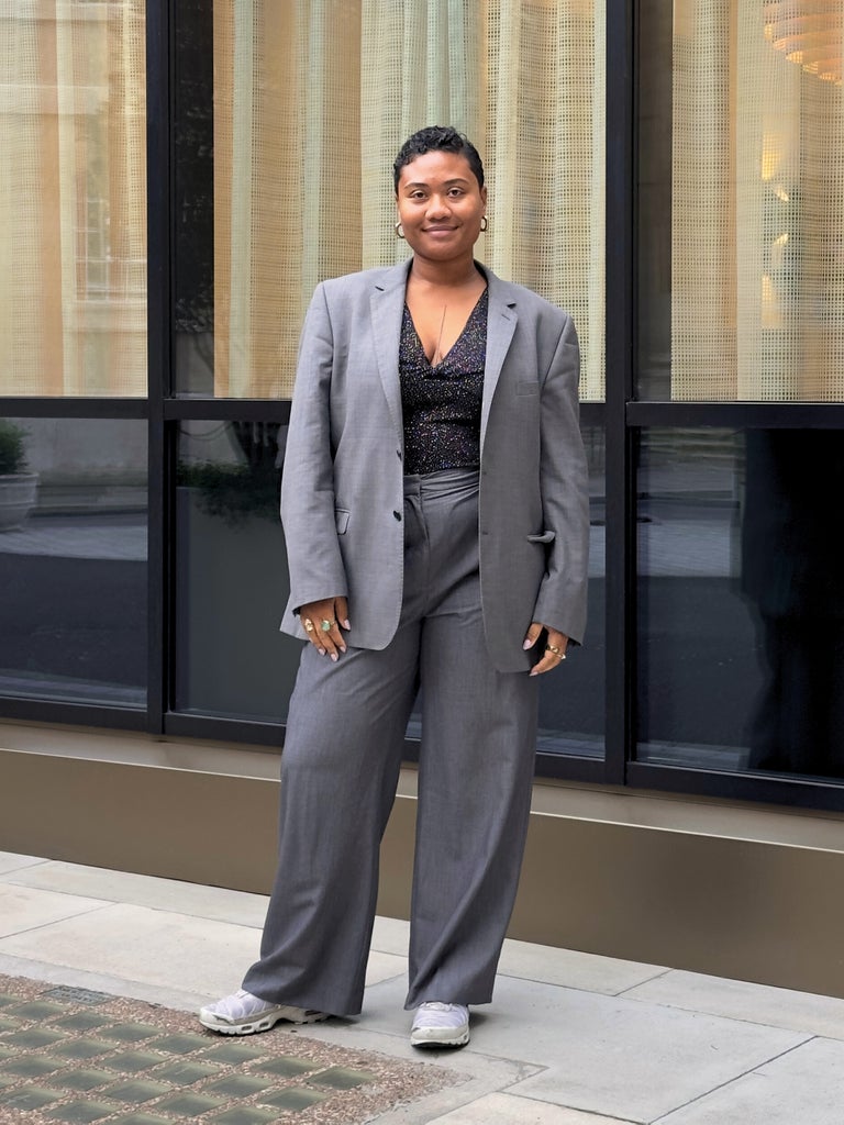 In my humble opinion, sequins should be worn year-round. Why should we wait until the holiday season to shine like the diamonds we are?! I’ve owned sequinned dresses, skirts and suits but never a bodysuit, so I’m loving the versatility of this Ba&sh one. For a daytime office look, I went for a ‘90s power-suit vibe, pairing my sequins with oversized separates and Air Maxes for comfort.