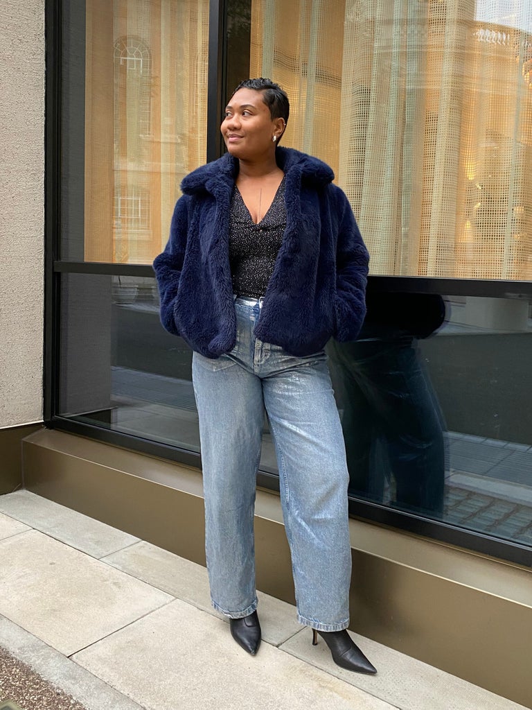 To transform the bodysuit for a nighttime look, I switched out the trousers for equally sparkly jeans, skinny heeled boots and a faux fur coat for warmth (and a different flavour of glamour). That said, you don’t have to do much to dress up sequins — I’d also pair this with a black midi skirt or wide-leg trousers for a holiday party or fancy dinner.