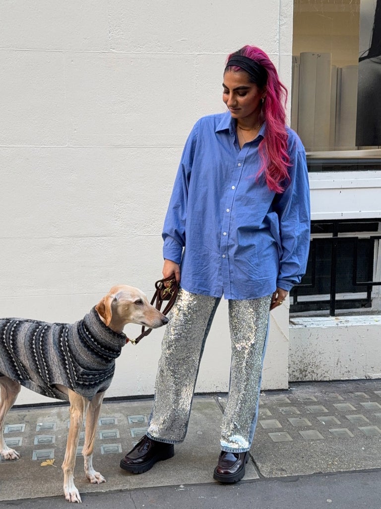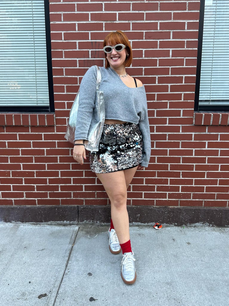 I was eager to style my favourite large-sequin mini skirt for the day, pairing it with an oversized grey sweater and metallic trainers to complement the silver embellishments. I also threw on a metallic tote bag and added a pair of bright red socks for a pop of colour that felt festive. I wore this out for flea market shopping, and felt comfortable (and not too dressed up).