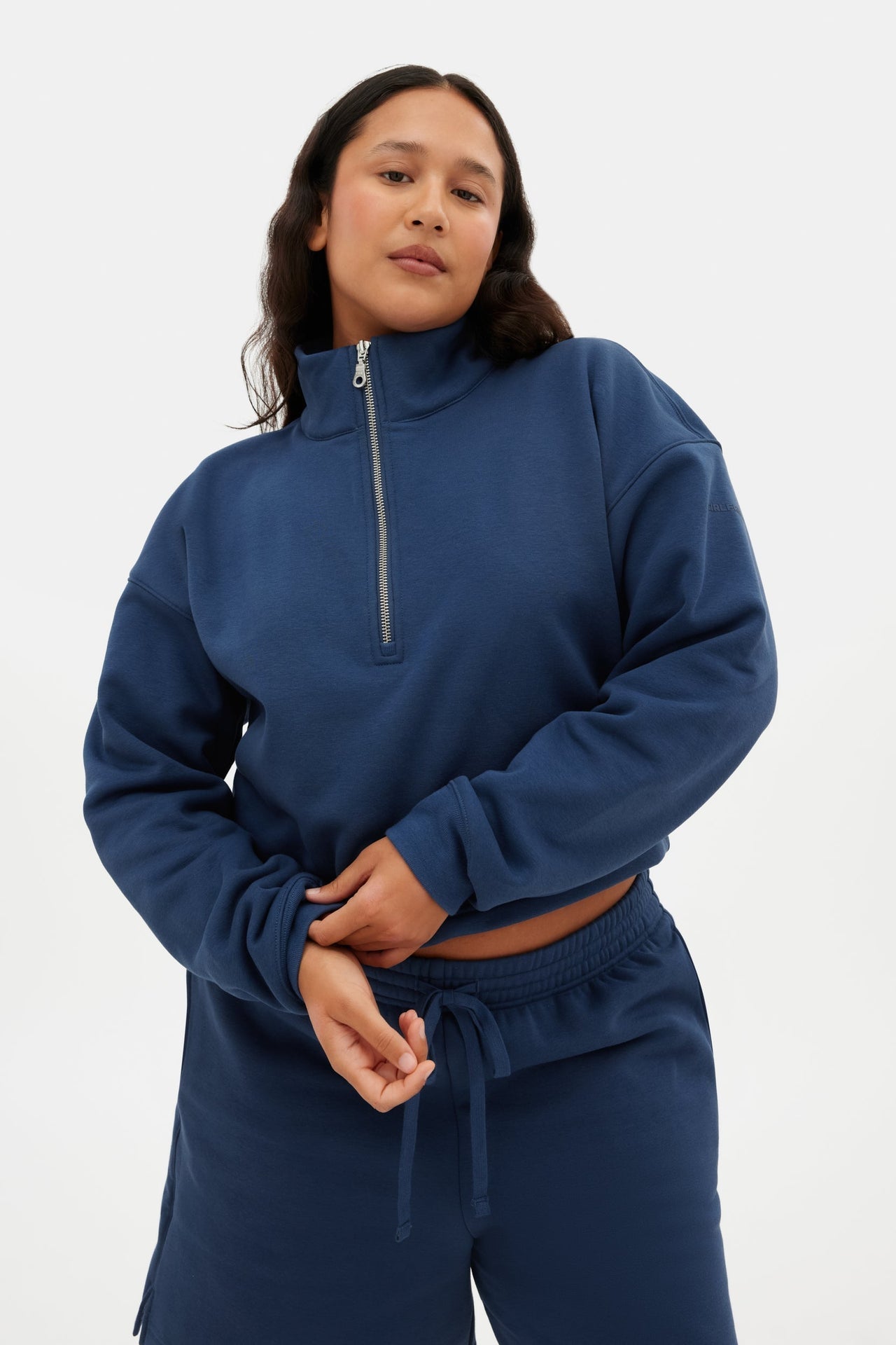 Available in sizes XXS to 6XL, this Girlfriend Collective set in a striking marine blue proves that comfort and style are truly for everybody. From the wide-leg pants with streamlined side pockets to the half-zip top with a clean, functional edge, it’s a laid-back combo with a sleek vibe.