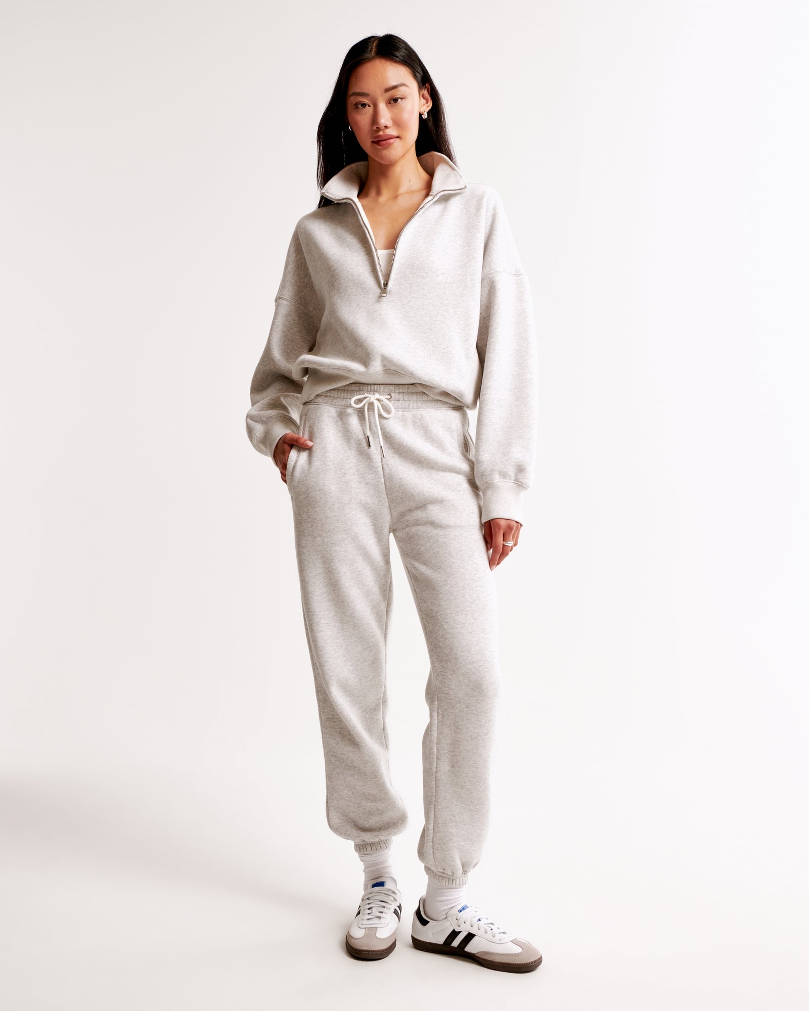 This Abercrombie half-zip and wide-leg sweatpant set is basically a Sunday morning ritual in wearable form. Crafted in plush heavyweight fleece with that just-right oversized fit, it’s the ultimate in serious lounging but ready to go for coffee runs, errand marathons or travel days.