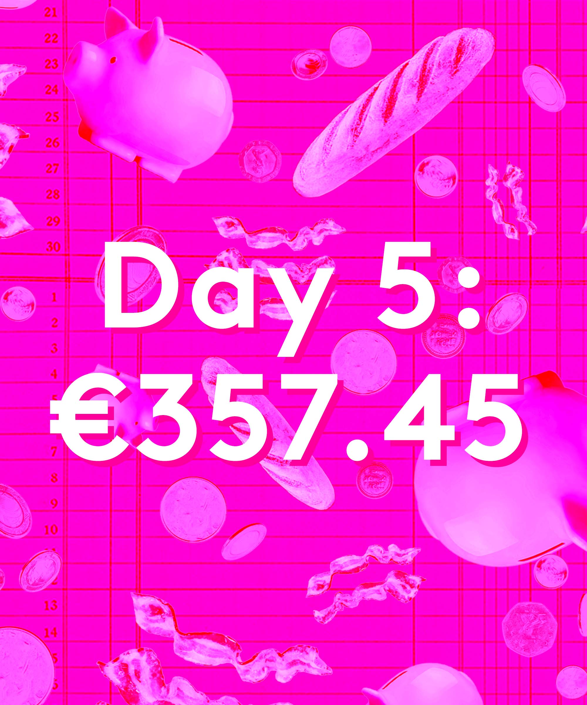 12 p.m. — I pack my gym kit then head out to meet a friend P for lunch. L heads out to play games with C and K and buys prosecco on the way. He puts it on the joint account as I drank a bunch of C’s prosecco last night. My share is €3.73.