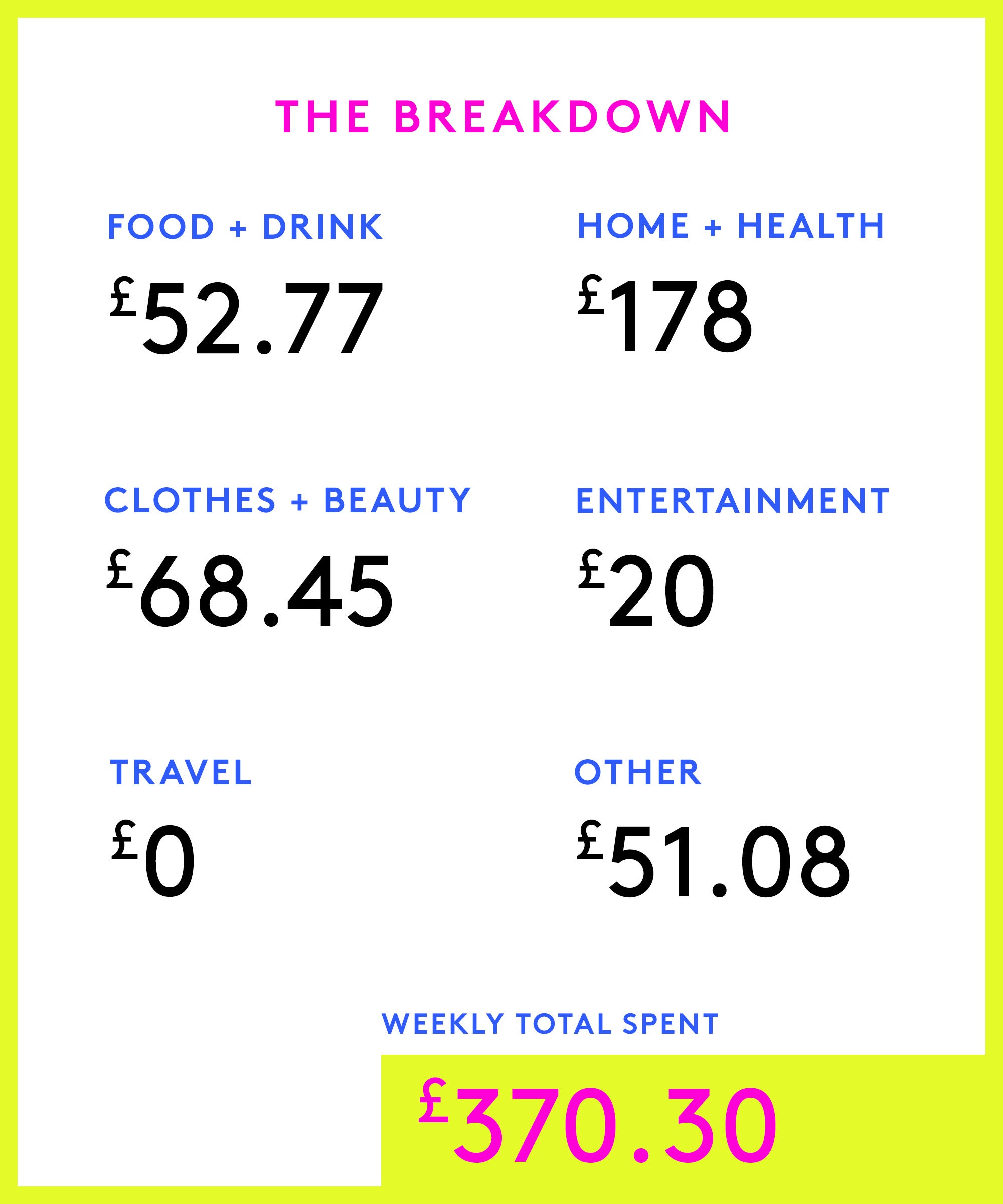 I would say that there are a few purchases which are not run of the mill and likely wouldn’t appear most weeks, like the visa and items for our holiday. My food and drink spend is also lower than normal this month because I’ve not been going out so much, but anything I’ve saved here has ultimately been swallowed up by the impulse house decor purchases I made on my trip to The Range. All in all, I’ve enjoyed doing the money diary and believe that it will make me more mindful of my day-to-day spending going forward.”