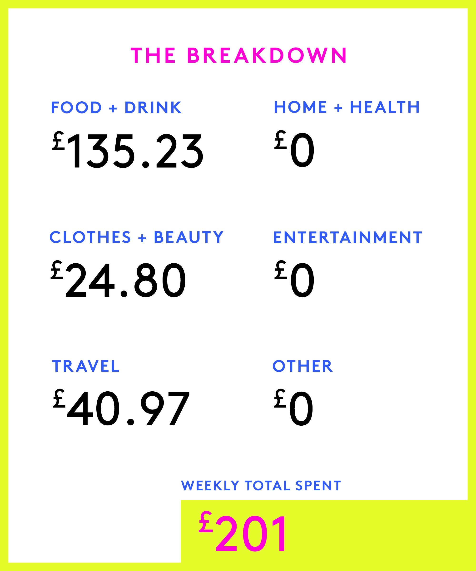 “I would say this is a pretty typical week for me. Although the food and drink cost was high, it mainly covered spending time with T and friends and for me that is always money well spent. I think I have a good balance between enjoying life week to week while saving money for bigger spends like holidays and the MANY costs that have and will continue to come up through the flat buying process. Like I said at the start I feel grateful that my salary is good enough for me to be able to have this balance. Overall I really enjoyed the process!”
