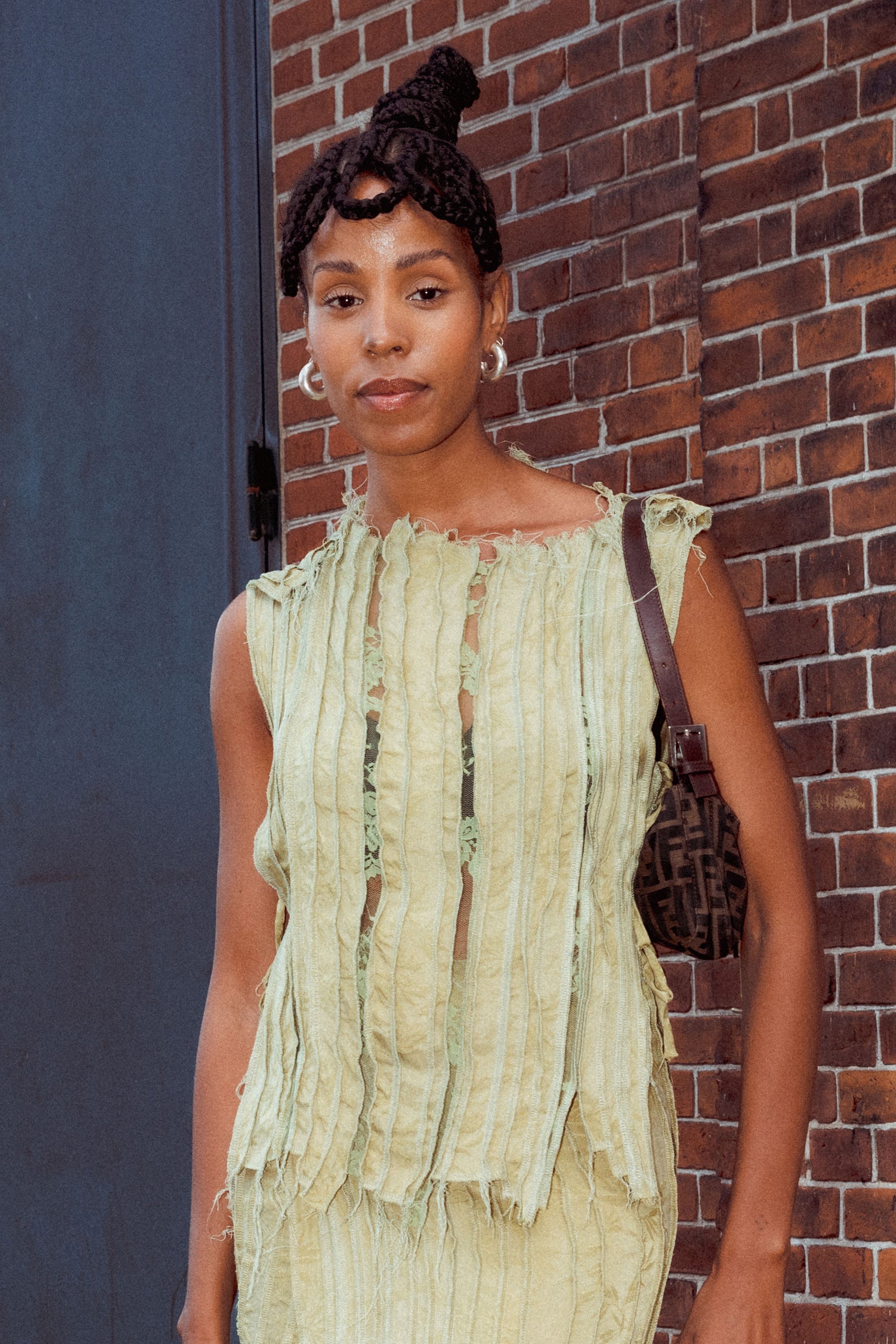 Half-up, half-down styles are timeless. We love the brighter face-framing pieces, which make this guest’s skin glow. Photographed by Emma Rahmani.These braided loop bangs paired with a pineapple bun look beautiful on this Copenhagen guest.