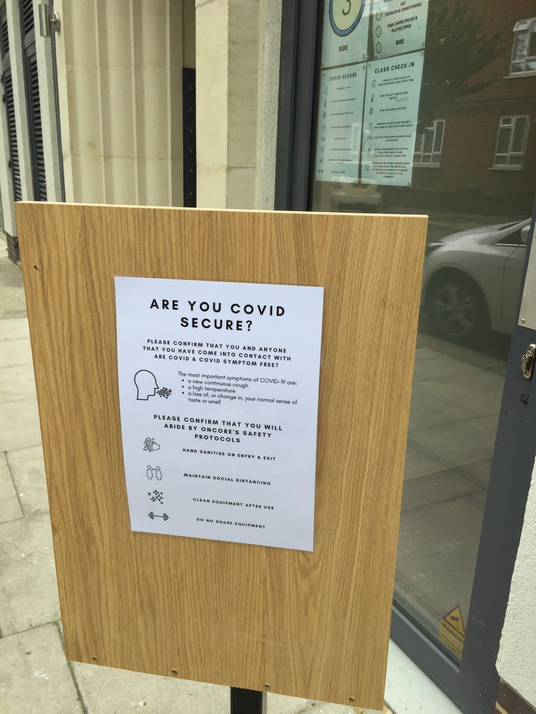 At OnCore in Clapham (where I had my class) we queued outside in a socially distant line while waiting for the attendees of another class to leave. Then, as part of our check-in process, we had our temperatures taken using a temp gun, our hands were sprayed with sanitiser and we were asked to publicly agree to an oath that we were ‘COVID secure’ and would follow safety protocols.
