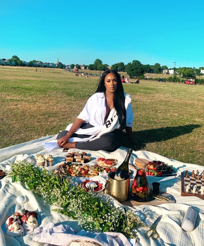 “I love bringing a large thick blanket, loads of champagne, some speakers and ready-prepared food. I always use Yours Bakefully picnic boxes because preparing food and keeping it cool is long. But also popping to your local supermarket to pick things up makes things easy to do. Since all my spring and summer holidays have been cancelled due to COVID-19, I’ve been dressing like I’m in the French Riviera or relaxing by the sea in Cape Town to make up for it.”