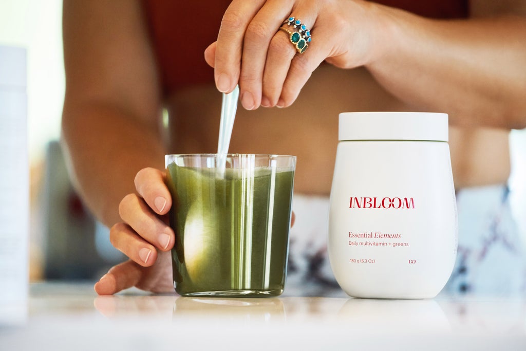 The starting lineup, which officially dropped online on Tuesday, includes five different powders — Essential Elements, Beauty Aura, Brain Flow, Energy Shift, and Dream Sleep — each made with 100% plant-derived, gluten-free, non-GMO ingredients housed in minimalist white glass containers that could pass as kitchen decor. “I wanted InBloom to feel like a better way to approach daily multivitamins,” Hudson said. “For example, I created our hero product, the Essential Elements, as a premium-sourced supplement for everyone. It’s multivitamins and greens, all derived from real plants. You can throw it in a smoothie, and the packaging is eco-friendly, with cute glass containers that are fully recyclable.”