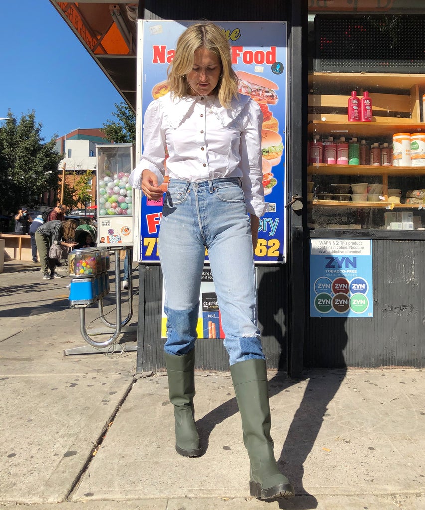 As someone who’s spent many hours in thrift shops and flea market stalls searching for a pair of Levi’s that fits, is worn in (but not too worn in), and doesn’t cost me an arm and a leg — as well as is a fan of Ganni — this seemed too good to be true. I had to try them. Upon slipping on the Ganni Repeat jeans for the first time, though, I was hooked. All of my vintage Levi’s have either been too big in the waist, thus leaving a gap in the back (you know the one), or too tight in the thigh and butt area. I’ve lost count of the many pairs I’ve ripped from trying to compromise on fit in one area just to get it right in another. To remedy that, these have a standard button-fly closing and an asymmetric one that allows for a tighter fit in the waist. (The asymmetric buttons, along with the patchwork details, check off two of the most popular denim trends.) Worn up high, the rise pairs perfectly with a tucked-in button-down, T-shirt, or tank top. Slouched, you can style them with an oversized sweater or a vintage tee. I chose the former, wearing the jeans tighter with a tucked-in white shirt. For one look, I tucked the hems into a pair of hunter green lug-soled rain boots. For another, I went classic with Gucci loafers.