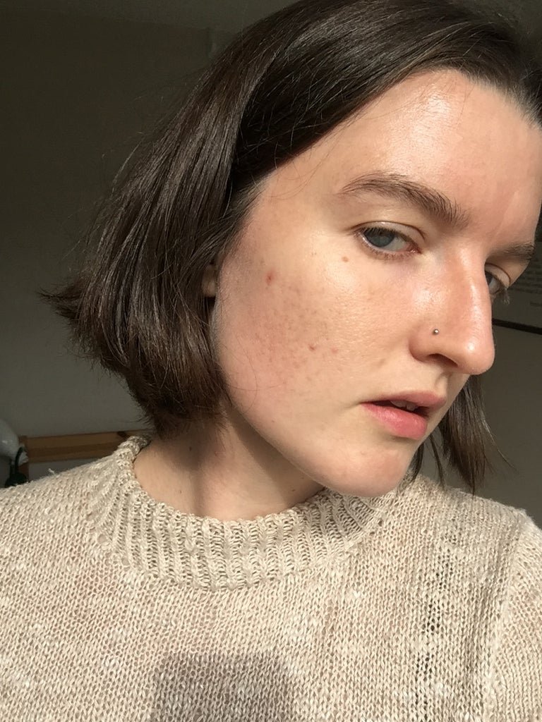 Reader, I was hit. The picture above was taken at the beginning of the week, before it all went wrong, but my skin did not look this good by the end of it. The day after taking this pic I started to get a swelling on my left jaw that just wouldn’t quit. I found myself worrying about it while I worked, diligently not picking or squeezing, but definitely poking at it. It was red and angry but I didn’t squeeze it.
