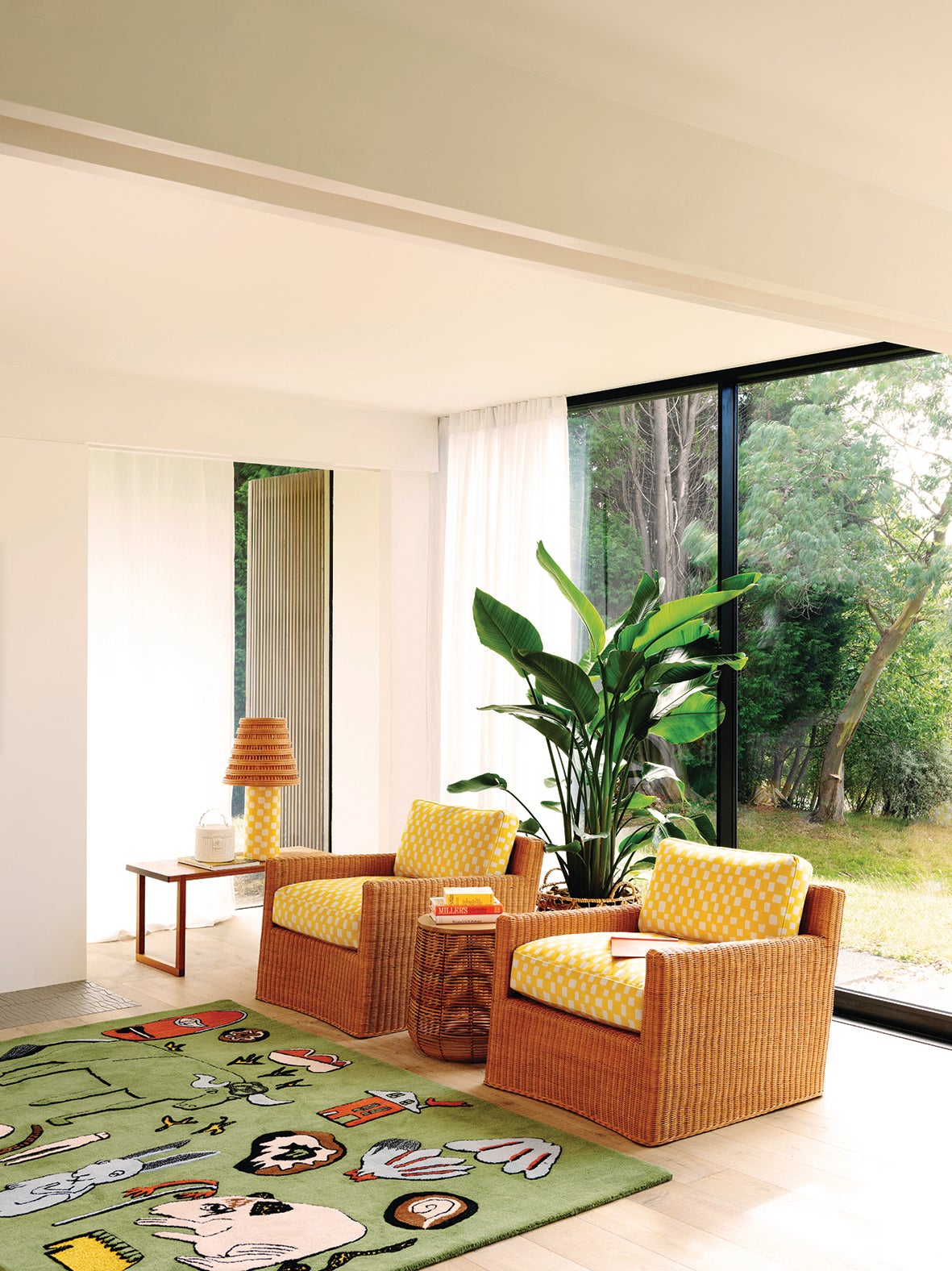 The collection’s rattan is handwoven in Vietnam, while the rugs and cushions are hand-finished in India and the ceramics are made in Portugal.
