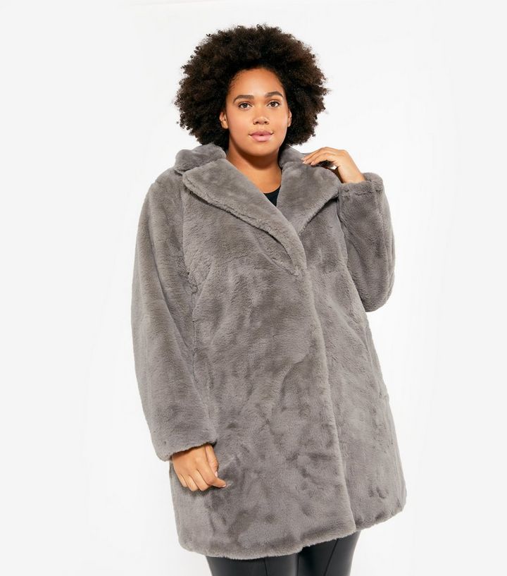 New Look Curves Dark Grey Faux Fur Long Coat, $, available at New Look