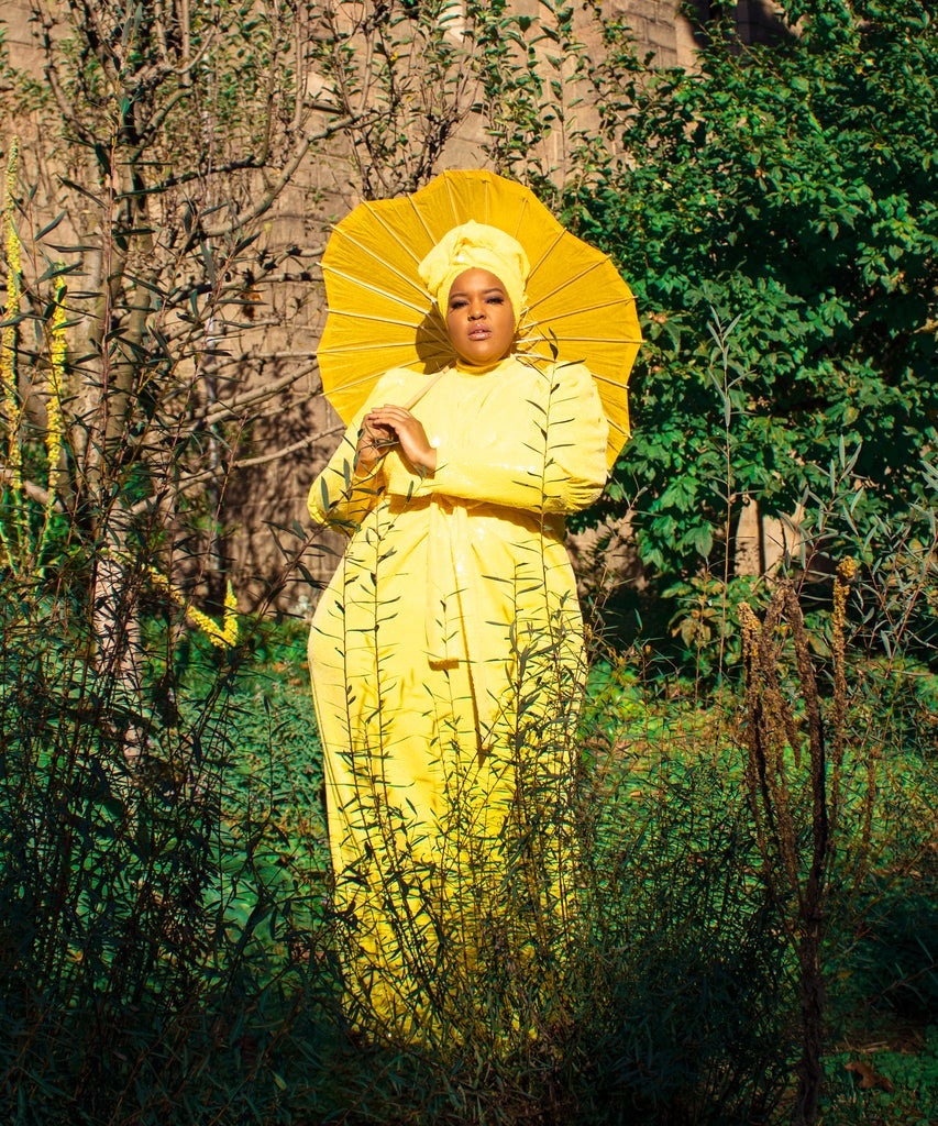 For the brand’s “Six Icons, Six Days” collection, Vernon, who is known for her colorful looks, designed a long-sleeved, sequin yellow gown. The dress, which she told Refinery29 is “the perfect combination of colour, drama, and poise,” features a large, bow-like detail in the centre, a mock neck, and exaggerated shoulders. In the campaign, Vernon wears the look with a matching yellow turban — that’s also part of the drop — and carries a golden umbrella (since the dress’ shade of yellow was so obviously reminiscent of the sun.) “I love all things glam — all things loud and bold and queen-like,” Vernon says of the inspiration behind her custom look. “The theatrics and the sequins are what I want to be in, even if I am just casually going to the dollar store. We should feel and look good, no matter what the activity. Tongue pop.”