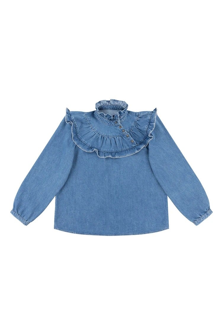 seventy + mochi Victoria Blouse in Washed Indigo Denim, $, available at seventy + mochi