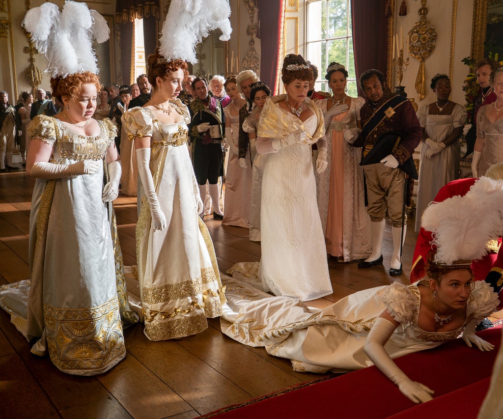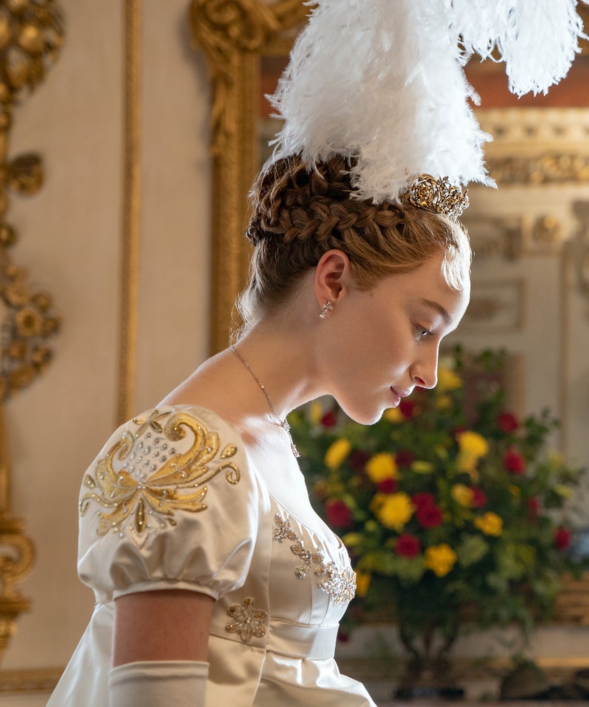 Eldest Bridgerton daughter Daphne and the three Featherington girls are all entering the social season to search for a husband, and their first stop is being presented to Queen Charlotte (Golda Rosheuvel). The Queen tells Daphne that she is “flawless,” which sends her into the season as the one to watch.