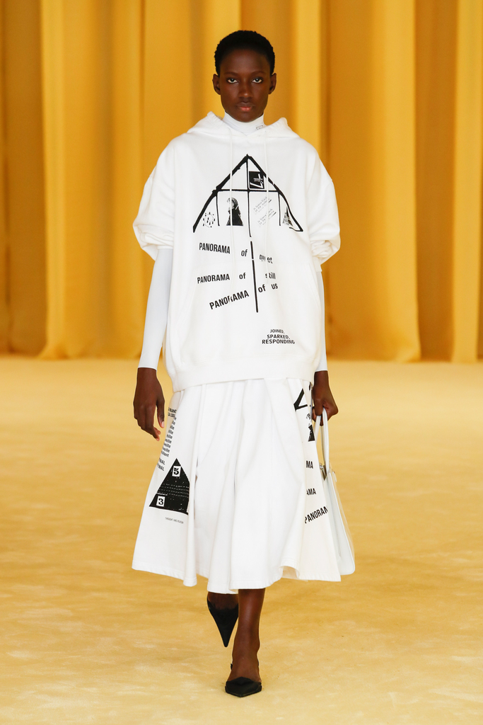 High-fashion’s heavy hitters are also embracing this hybrid aesthetic of laid-back business attire. Case in point: Miuccia Prada and Raf Simons’s S/S 21 co-debut featuring extra-long hoodies layered over voluminous skirts paired with pointy-toed kitten heels (see photo above). Plus-size retailer 11 Honoré also recently launched an “Athluxury” collection. The retailer’s design director Danielle Williams-Eke describes it as “pieces that can work comfortably throughout the day but that are chic, stylish, and fit well.” This translates into a size-inclusive selection of satin T-shirts, cashmere dusters, and silky wide-leg pants from its private label and by brands such as LNA, LaPointe, Azeeza, and Baja East — all of which are worthy of a pin on an Athflow board.