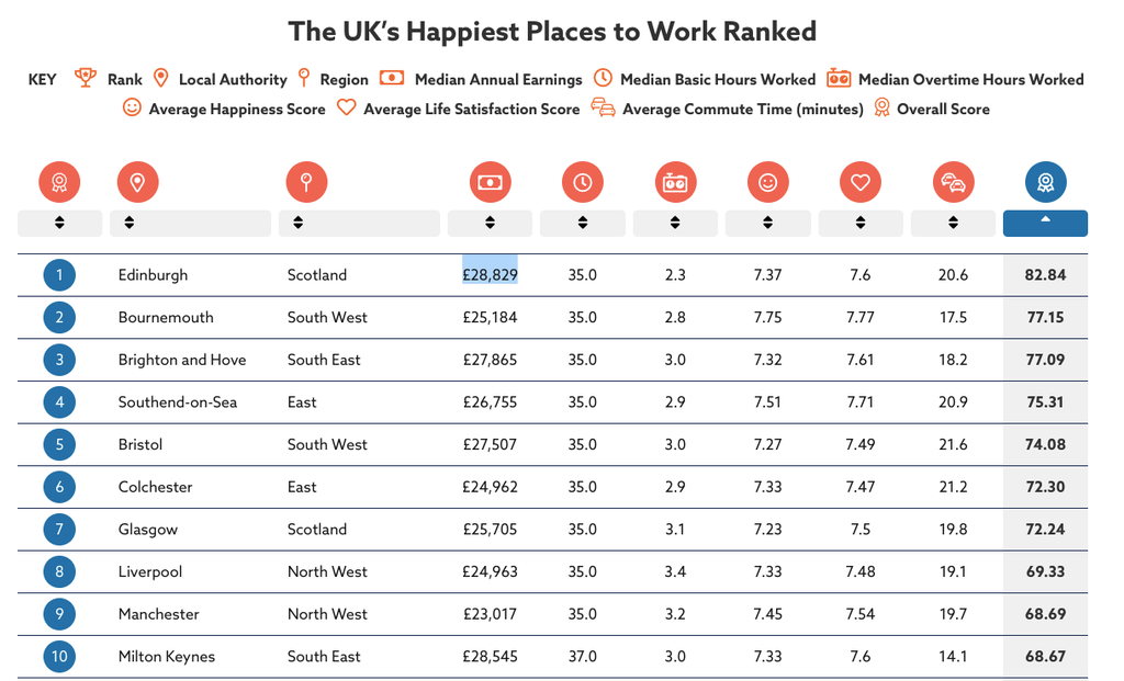 Edinburgh places first with an average salary higher than any other city in the top ten: £28,829. The Scottish capital also benefits from relatively low overtime hours (2.3 per week) and a high life satisfaction score of 7.6 out of 10.